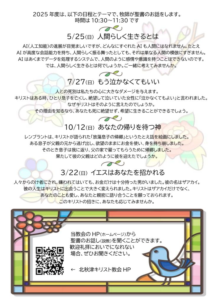 9/222025 10/12(日)歓迎礼拝のご案内 お知らせ 普段、礼拝にいらしていない方にもわかりやすく、ルカの福音書15章から「あなたの帰りを待つ神」という説教がされます。どなたもおこしください。 レンブラントは、キリストが語られた「放蕩息子の帰郷」というたとえ話を絵画にしました。ある息子が父親の元から逃げ出し、欲望のままにお金を使い、身を持ち崩しました。そのとき息子は我に返り、父の家で雇ってもらうために帰郷しました。果たして彼の父親はどのように彼を迎えたでしょうか